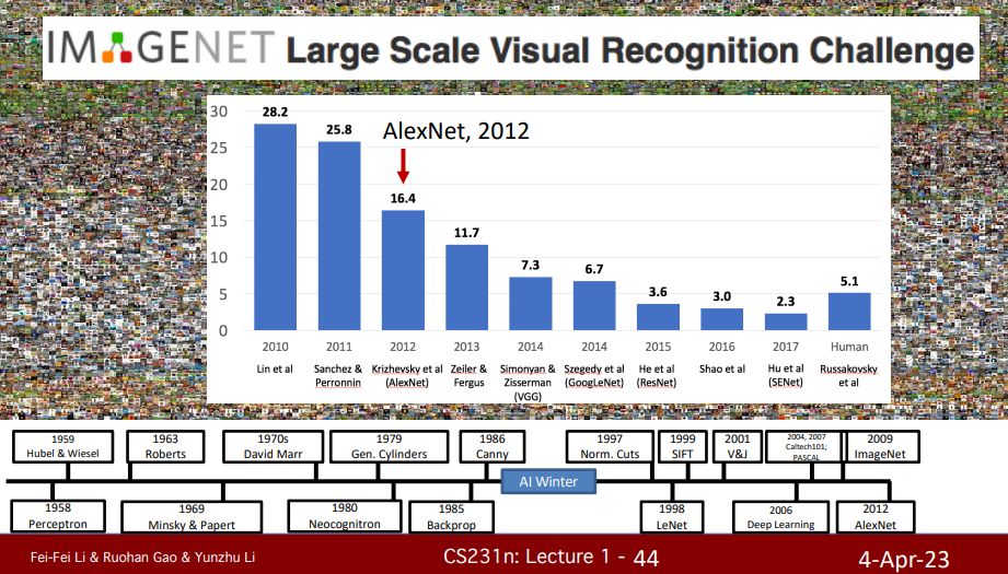 이때 대회에서 우승한 알고리즘인 대규모 데이터셋을 활용한 CNN: Convolutional Neural Network 모델이 현재의 Deep Learning의 한 형태이며, 모델의 동작 원리와 학습 방법이 이번 강의의 전반적인 주제가 될 것 같습니다.