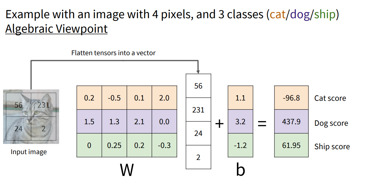 위 이미지는 32×32×3 크기의 컬러(RGB) 이미지를 3072차원 벡터 \(\mathbf{x}\)로 펼친 뒤, 10×3072 크기의 weight matrix \(\mathbf{W}\)를 곱하고, 10×1 크기의 bias vector \(\mathbf{b}\)를 더해 10차원 결과 \(\mathbf{f}(\mathbf{x}) = \mathbf{W}\mathbf{x} + \mathbf{b}\)를 얻는 과정을 보여줍니다.
