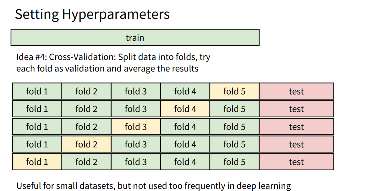 또한, 데이터가 적을 경우에는 교차 검증(Cross Validation) 기법을 활용하기도 합니다. 예를 들어 5-Fold Cross Validation에서는 트레이닝 데이터를 5개로 나누어, 그중 4개로 학습하고 1개로 검증하는 과정을 다섯 번 반복해 하이퍼파라미터를 결정합니다. 다만 딥러닝처럼 대규모 모델에서는 계산 부담이 커서 교차 검증을 자주 쓰지 않는 편입니다.