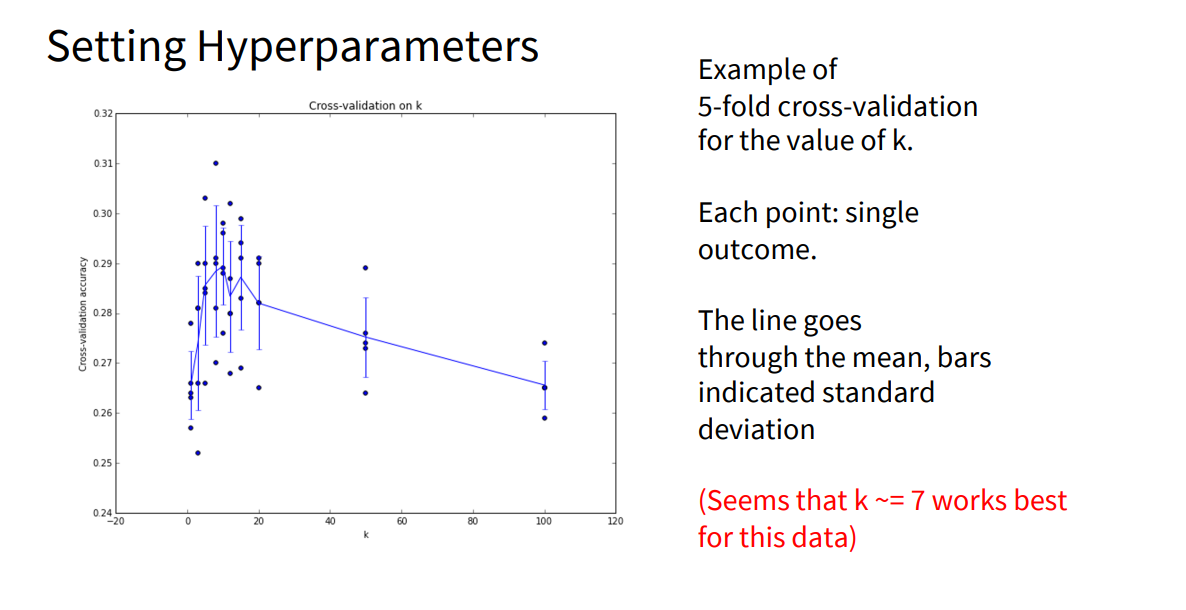 예를 들어, k-NN에 대해 5-Fold Cross Validation을 수행한 결과를 그래프로 나타내면, X축은 K(이웃 수), Y축은 분류 정확도가 되고, 각 점은 단일 실험 결과, 세로선은 표준 편차를 의미합니다. 여기서 K=7에서 성능이 가장 좋게 나타났으며, 폴드를 나누어 반복 실험하므로 분산(variance)도 함께 확인할 수 있습니다. 이렇게 교차 검증을 거치면, 데이터 분포가 완벽히 i.i.d. 가 아니더라도 어느 정도 신뢰할 만한 하이퍼파라미터를 선택할 수 있습니다.
