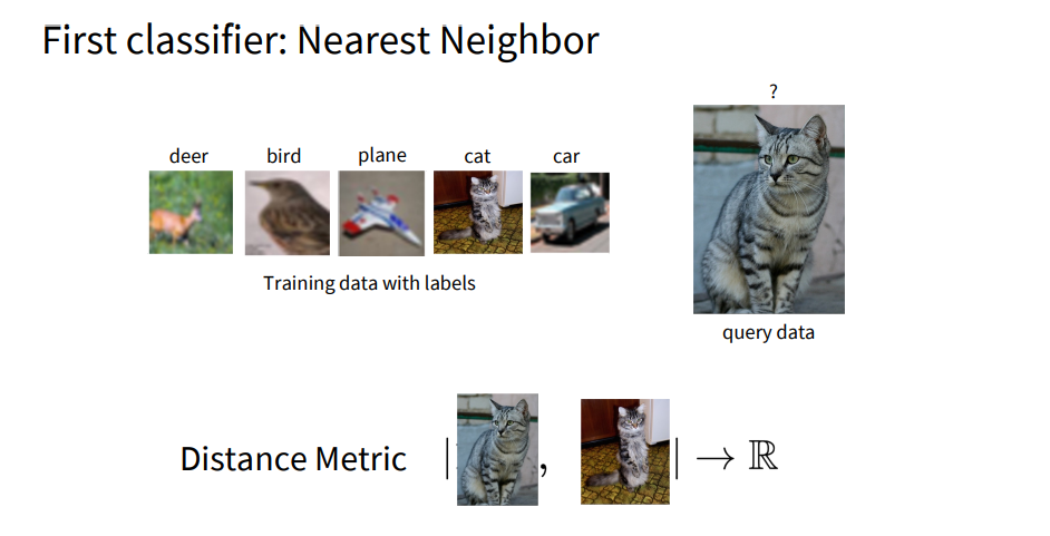 NN Classifier는 가장 단순한 형태의 분류기 중 하나입니다. 이 알고리즘의 핵심 아이디어는 학습 단계에서 별도의 모델을 만들지 않고, 단지 학습 데이터를 그대로 저장해 두었다가, 예측할 때 저장된 데이터 중에서 입력 이미지와 가장 유사한 샘플의 레이블을 반환하는 것입니다.