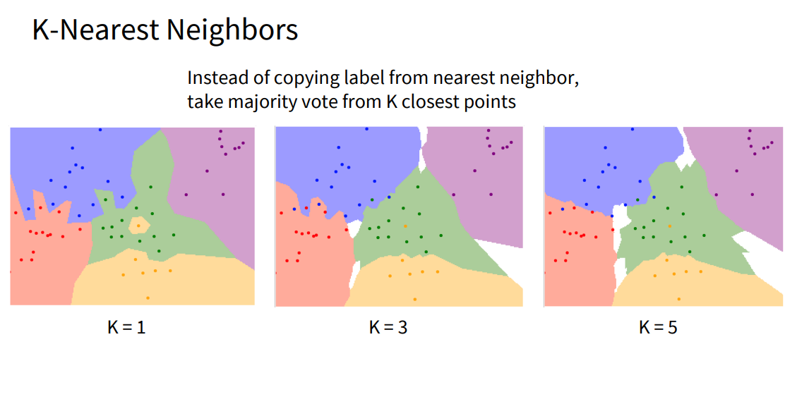 그렇다면 labeling이 안 된 흰색 지역은 어떻게 처리할까요? 이는 예제에서 “가장 가까운 이웃”을 찾지 못하거나, k개 이웃 간 다수결이 불가능한 경우를 단순히 흰색으로 처리했기 때문입니다. 실제로는 추가적인 규칙이나 추론 방법을 적용해 이 부분을 보완할 수 있습니다. 또, 이미지를 고차원 벡터로 볼 때는 픽셀 간 거리가 노이즈에 취약할 수 있으므로, k값 조절이나 L1/L2 같은 거리 척도 선택을 신중히 해야 합니다. 이러한 간단한 원리만으로도 텍스트 등 다양한 데이터에 적용할 수 있다는 점이 k-NN의 장점입니다.