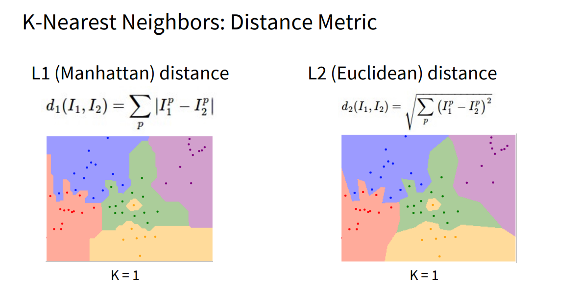 예컨대 L1 Distance는 각 좌표축(특징)이 독립적인 의미를 가질 때 유리할 수 있고, L2 Distance는 좌표계 변화(회전 등)에 영향을 덜 받아 일반적인 유사도 측정에 자주 쓰입니다. 결국 하이퍼파라미터 선택은 문제에 따라 달라지므로, 여러 시도를 통해 최적 값을 찾아가는 과정이 필요합니다.
