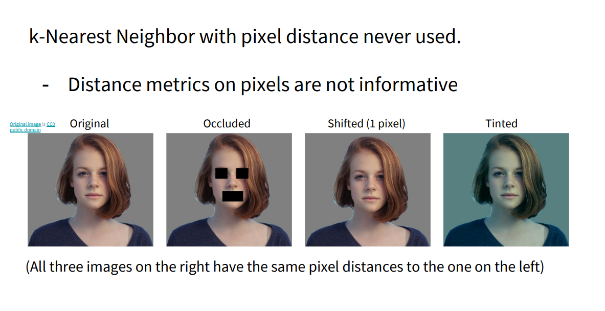 하지만 k-NN 분류기를 실제 이미지 분류에 적용하는 일은 드뭅니다. 위 이미지를 보면, 왼쪽은 원본이고 오른쪽 세 장은 얼굴 일부가 가려지거나 픽셀이 살짝 이동했거나 색조가 바뀐 사례입니다. 그런데 픽셀 단위로 L2 Distance를 계산하면 이 세 장 모두 원본과 동일한 거리로 측정됩니다. 이는 k-NN에서 사용하는 단순 거리 척도가 ‘지각적 유사도’를 전혀 반영하지 못한다는 것을 잘 보여줍니다. 게다가 k-NN은 예측할 때 모든 학습 샘플과 거리를 비교하므로 속도가 느리고, 고차원(예: 이미지) 데이터일수록 필요한 샘플 수가 기하급수적으로 늘어나는 차원의 저주 문제도 큽니다. 이런 이유들로 실제 이미지 분류에서는 k-NN을 거의 사용하지 않습니다.