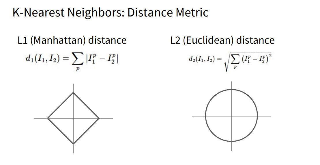 그렇다면 이제 거리 척도(distance metric)를 어떻게 선택하느냐에 따라 공간이 어떻게 달라지는지 살펴봅시다. 예를 들어, L1 Distance(Manhattan)에서는 원점으로부터 일정 거리에 있는 점들이 사각형 모양으로 나타납니다. 좌표계를 회전하면 이 모양도 달라지죠. 반면, L2 Distance(Euclidean)에서는 우리가 익숙한 ‘원(circle)’ 형태가 나오며, 좌표계 회전에 영향을 받지 않습니다. 따라서 키·몸무게처럼 각 특징이 독립적인 의미를 가질 때는 L1이, 요소 간 관계가 복잡하고 회전 불변성이 중요한 경우에는 L2가 더 적합할 수 있습니다. 이런 유연성 덕분에 k-NN은 이미지뿐 아니라, 텍스트처럼 전혀 다른 종류의 데이터에도 적절한 거리 척도만 정의해주면 적용 가능하다는 장점이 있습니다.
