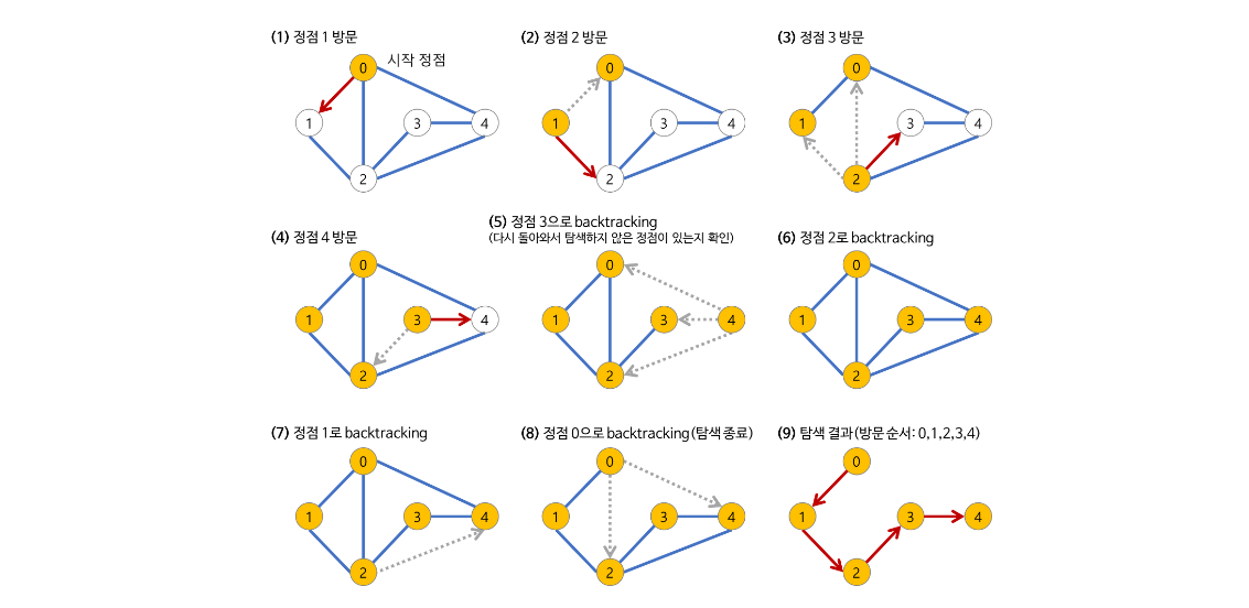 - 모든 인접 정점을 다 방문했으면 이전 정점으로 되돌아간다.