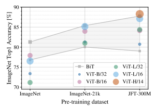사용한 데이터셋: ImageNet (약 130만 개), ImageNet-21k (약 1400만 개), JFT-300M (3억 개 이상)