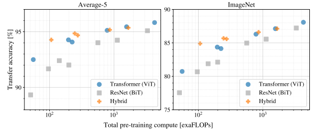 - Hybrid 모델은 연산 자원이 적을 때만 ViT보다 소폭 우수하나, 모델이 커지면 차이 사라짐.