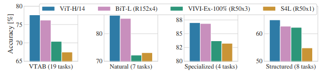 Figure 2에서는 VTAB의 작업들을 Natural, Specialized, Structured 세 가지 그룹으로 나누어 비교하였다. 여기서는 기존 기법인 BiT 외에도, VIVI(ResNet 기반으로 ImageNet과 YouTube에서 공동 학습된 모델), S4L(ImageNet 기반의 지도 및 반지도 학습 모델)과의 성능 비교가 이루어졌다. 그 결과, ViT-H/14는 Natural 및 Structured 작업에서 BiT-R152x4와 다른 기존 방법들보다 더 우수한 성능을 보였으며, Specialized 작업에서는 상위 두 모델 간의 성능이 유사하였다.