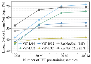 - JFT-300M의 일부 서브셋을 무작위로 추출해, 정규화 없이 모델 특성만 평가.