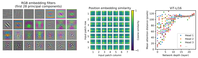 → CNN보다 훨씬 빠르게 전역 정보를 통합할 수 있음 - 다른 head는 인접한 패치들만을 대상으로 정보를 처리함
