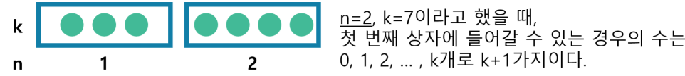 - \( n = 2 \)일 때: \[ \binom{2 + k - 1}{k} = \binom{k + 1}{k} = \binom{k + 1}{1} = k + 1 \] → 2개 중에서 중복을 허용하며 k개를 고르는 경우의 수는 항상 \(k + 1\)가지.